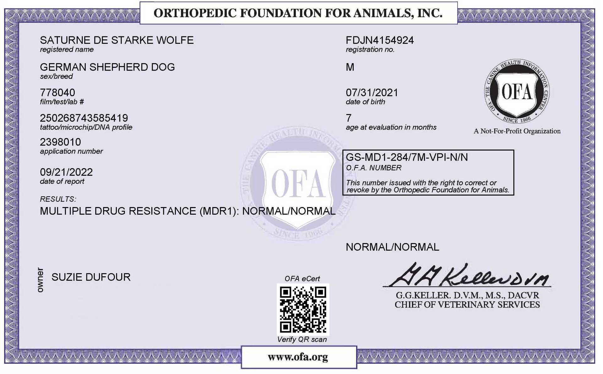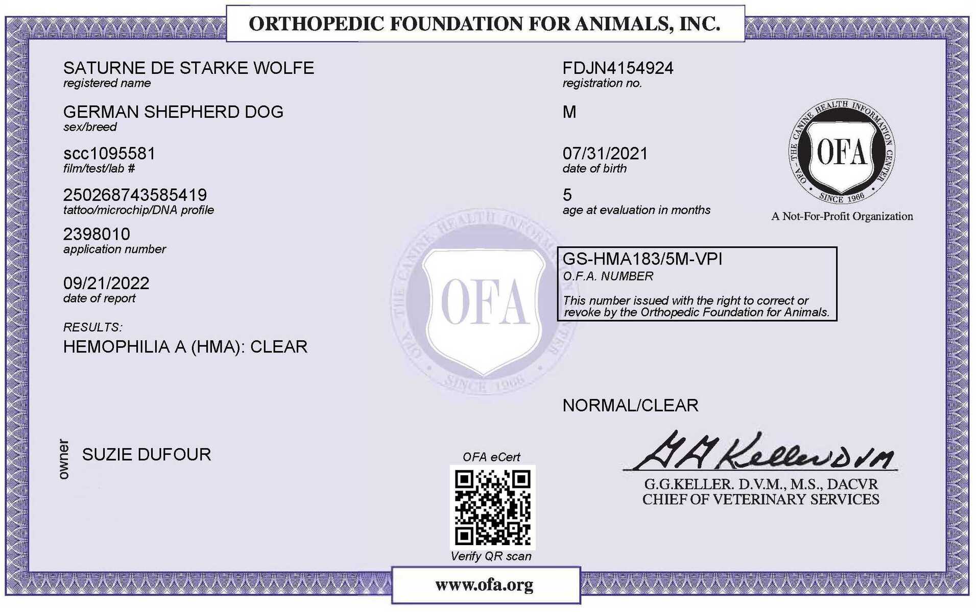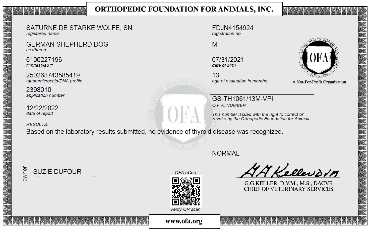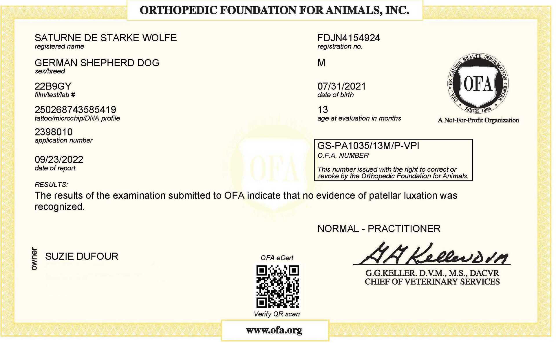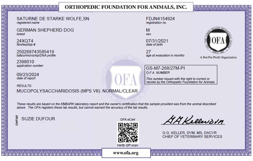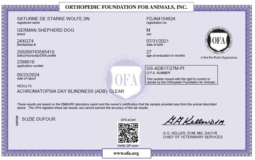 Vous trouverez les certificats ci-dessous. Certaines zones d’ombre sont volontaires car l’information est confidentielle. Nous ne pourrons jamais garantir une lignée exempte de maladies, nous faisons le maximum pour avoir les meilleurs reproducteurs et reproductrices.