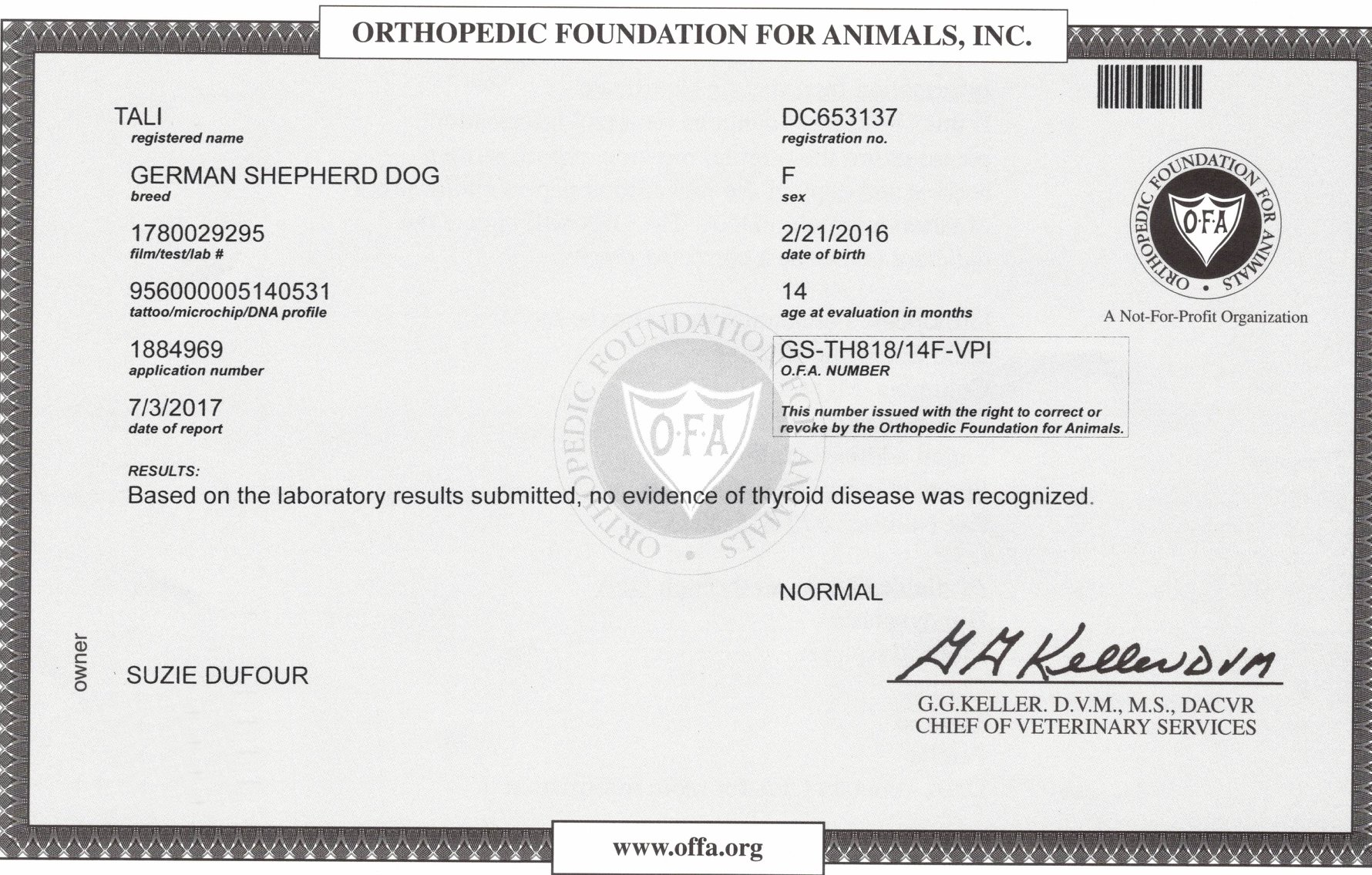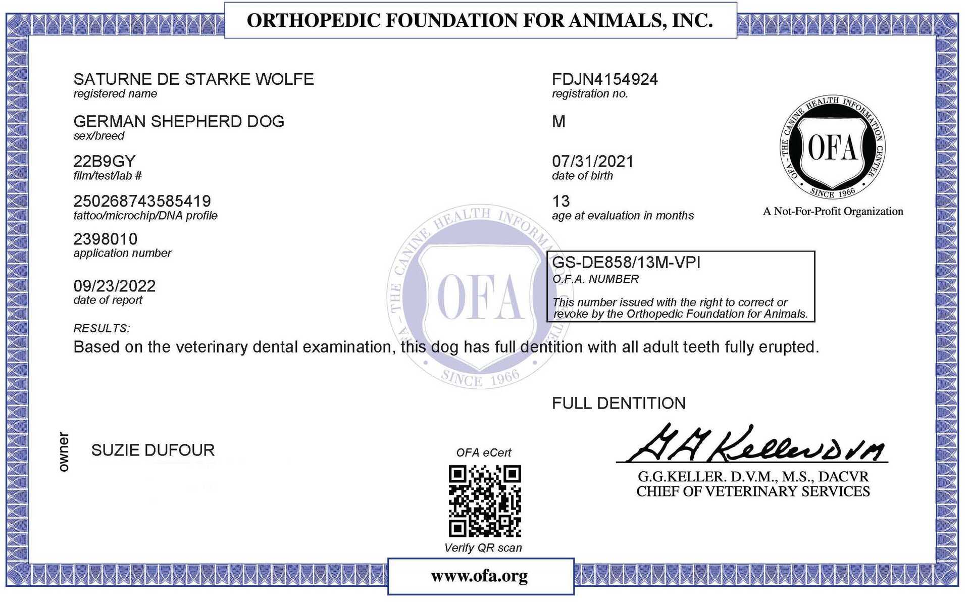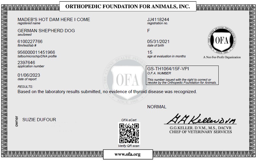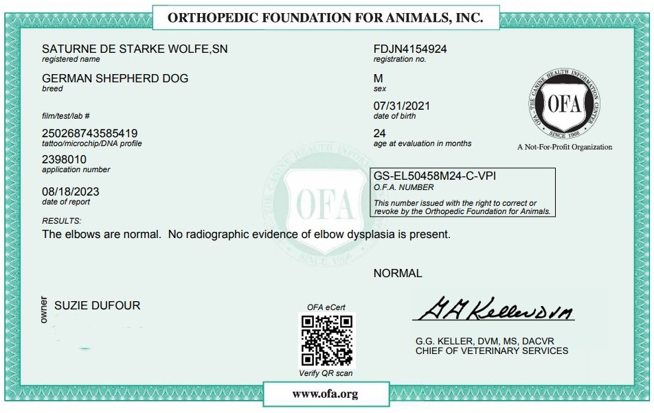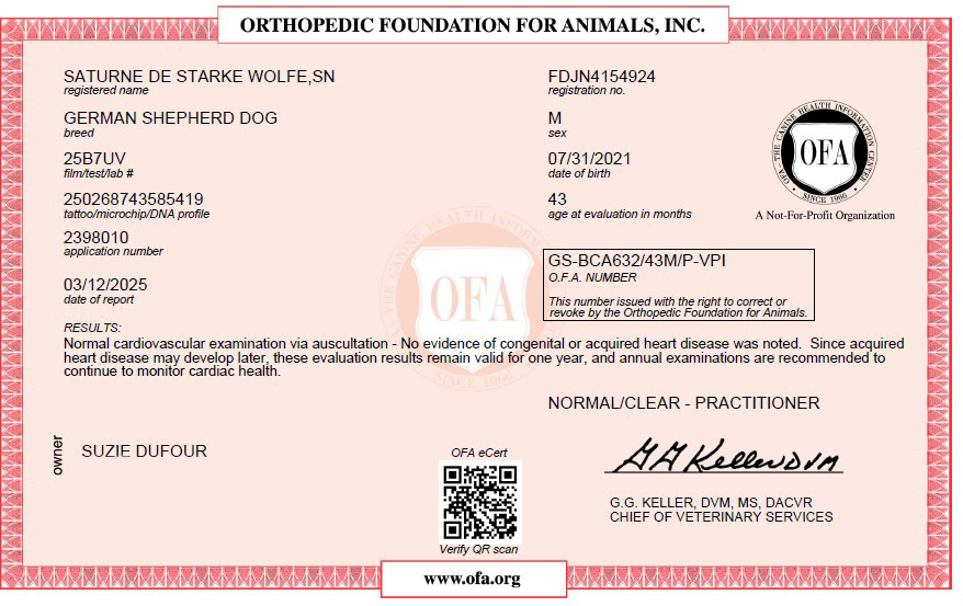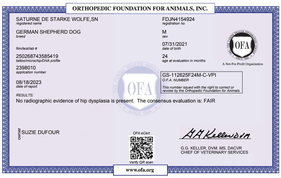 For us, genetics are very important. All our dogs pass the tests that are suggested by the German Shepherd Club of Canada as well as recommended by OFA. You will find the certificates below. Some gray area is voluntary, the information is confidential. We can never guarantee a disease-free lineage, we do our best to have the best breeding.